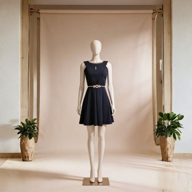 Vestido de cóctel en scuba crepé negro.diseño entallado con escote redondo,detalle de gota y aplicación dorada en el cuello.Falda acampanada tipo A que estiliza